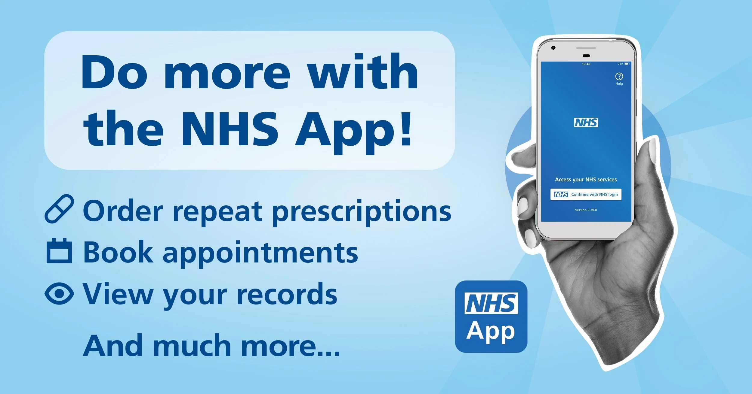 The NHS App allows you to access a range of NHS services. You can download the NHS App on your phone or tablet. You can also access the same services in a web browser by clicking here